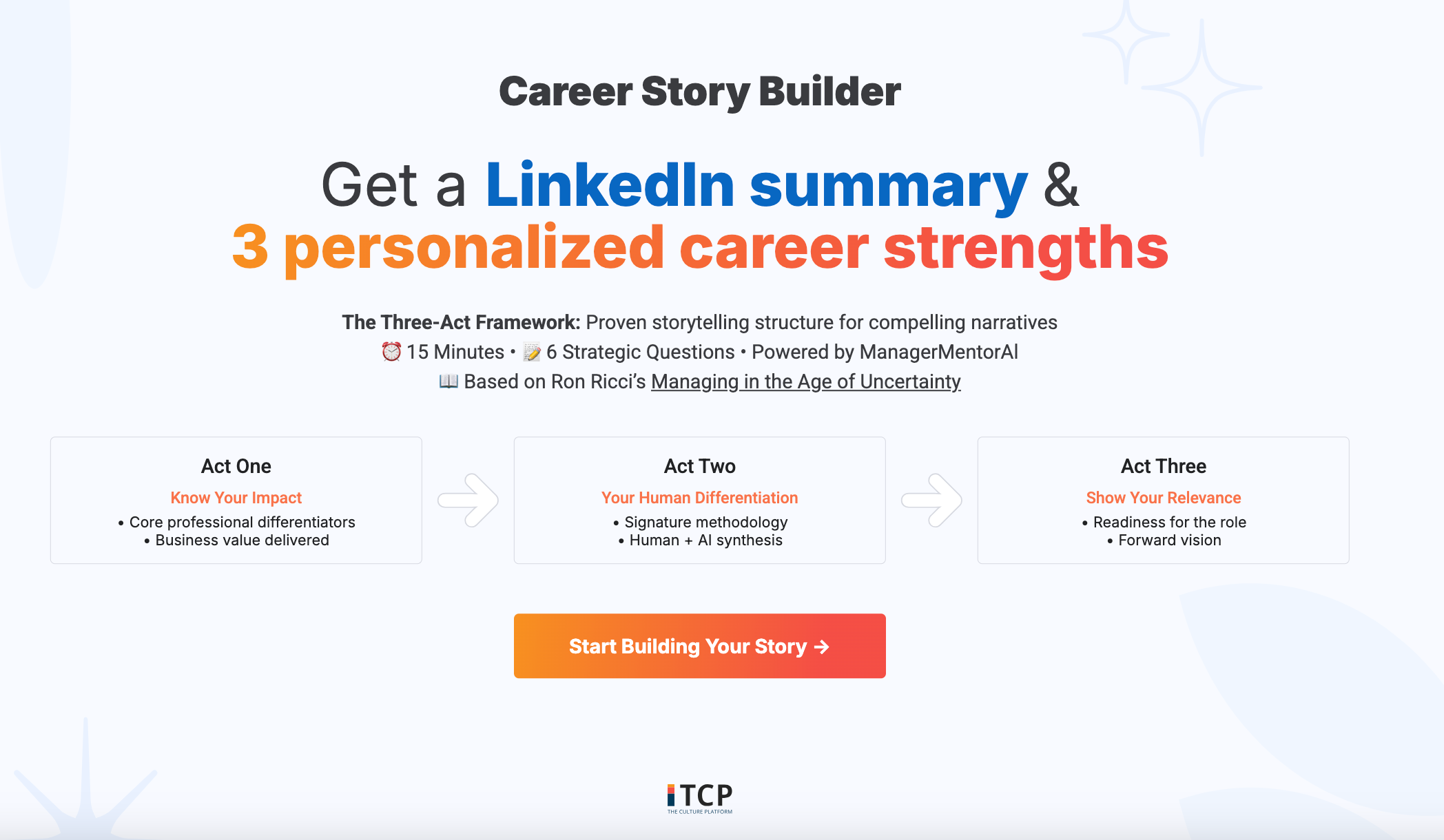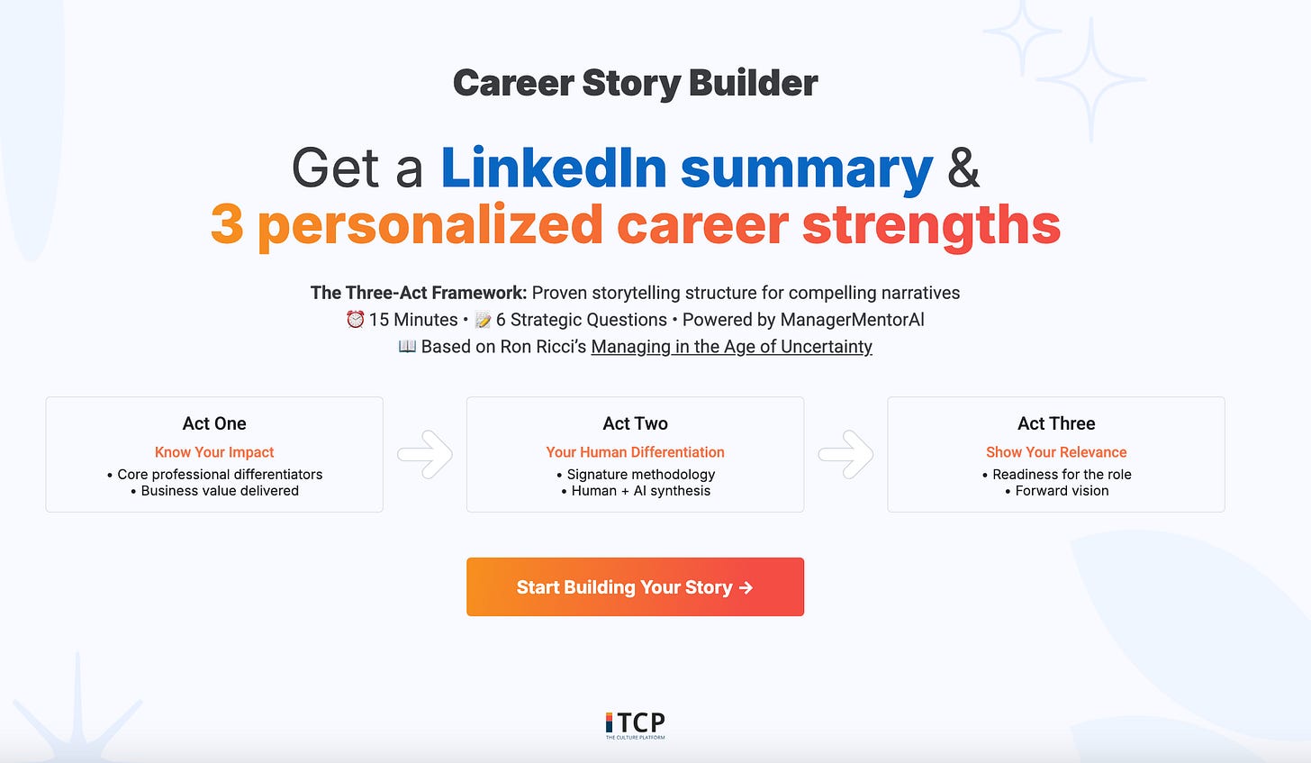 Here’s what I’m building in public: I’m teaming up with my friend and master storyteller Patti Sanchez (co-author of Illuminate) to launch what we’re calling the Career Story Builder – an AI-powered tool that helps anyone tell a compelling story about themself.